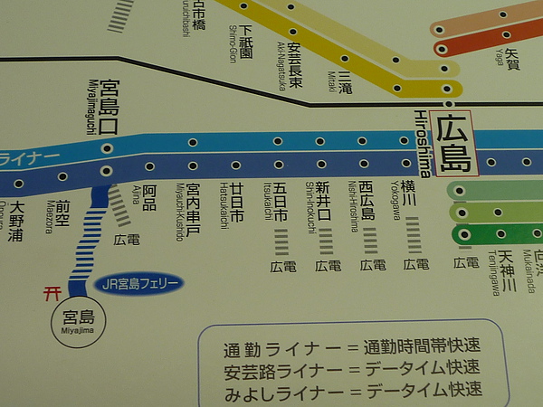 後面兩者都有配合的汽船渡口:JR有艘JR輪,地面電車是松大汽船;渡口到宮島坐船約10分鐘
